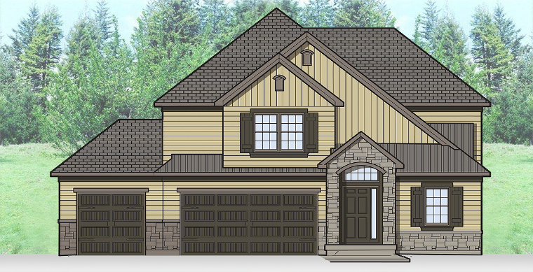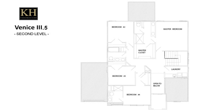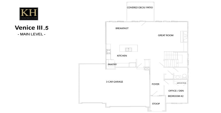 Venice III.5 features an inviting foyer flanked by an office area and half-bath. A spacious great room includes a stacked stone hearth and opens to a comfortable breakfast area and island kitchen that includes a walk-in pantry. The vaulted ceiling in the master suite emphasizes the spacious comfort, and the suite includes an elegant bathroom with separate vanities, a tub, a tiled shower, and a walk-in closet. Three additional bedrooms and two full baths, and laundry area complete the second story. Floorplan includes a three-car garage, covered deck, and basement with a bath and shower.